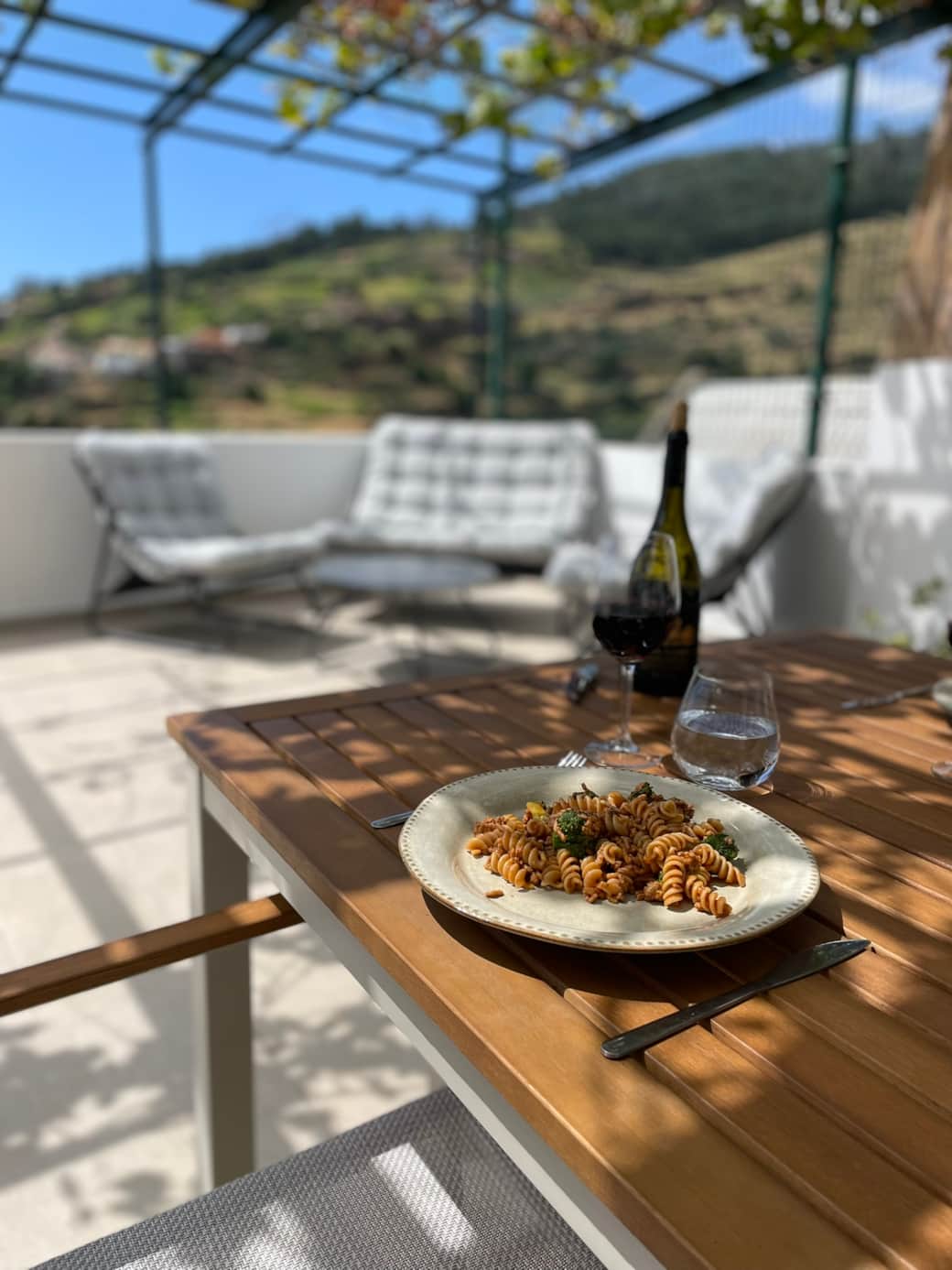 The suites feature modern kitchens and a warm, inviting atmosphere, with comfortable beds and luxurious bathrooms. From Suite Jardim, you overlook a lush garden filled with vibrant plants and flowers. The shared rooftop terrace offers panoramic views, from the sea up into the mountains.